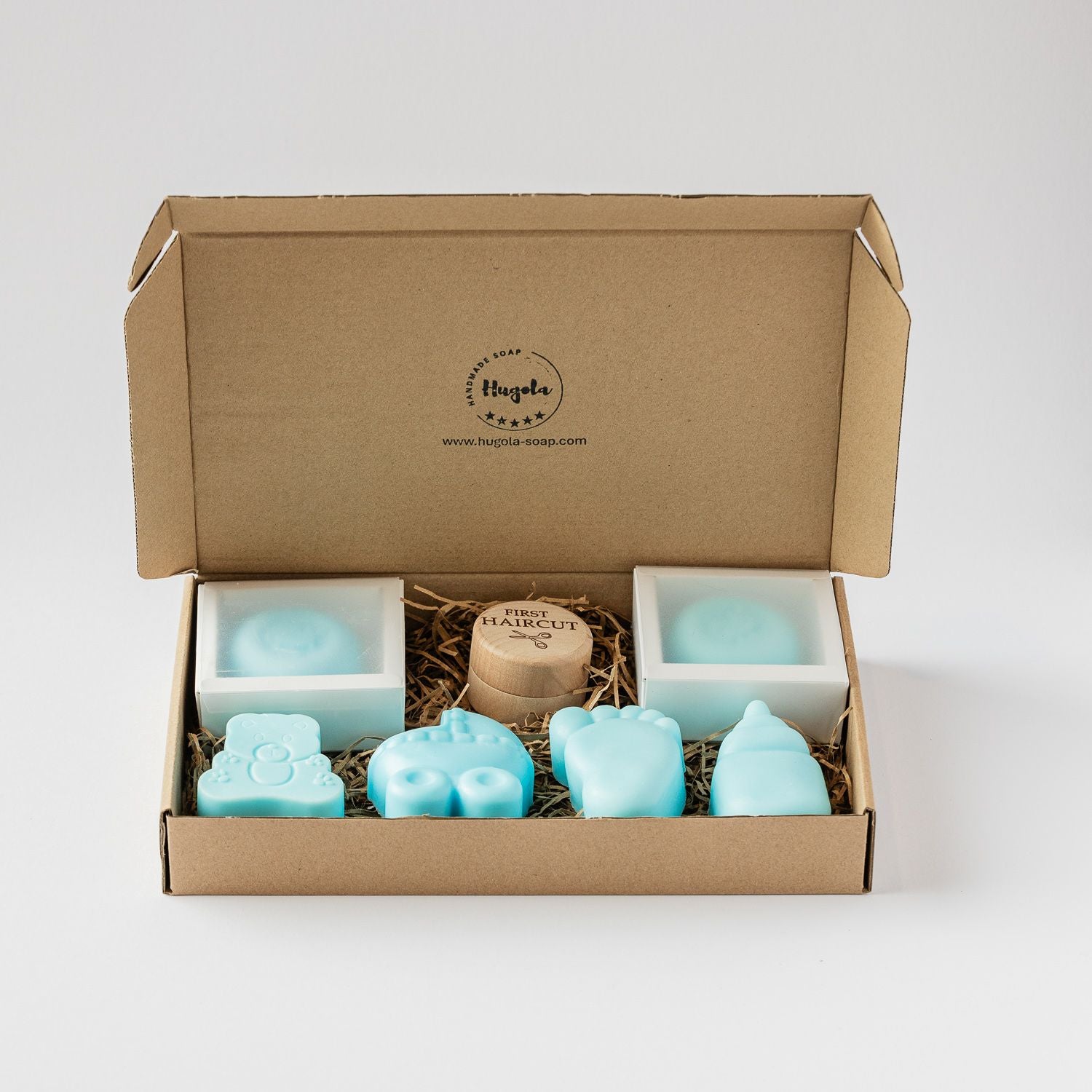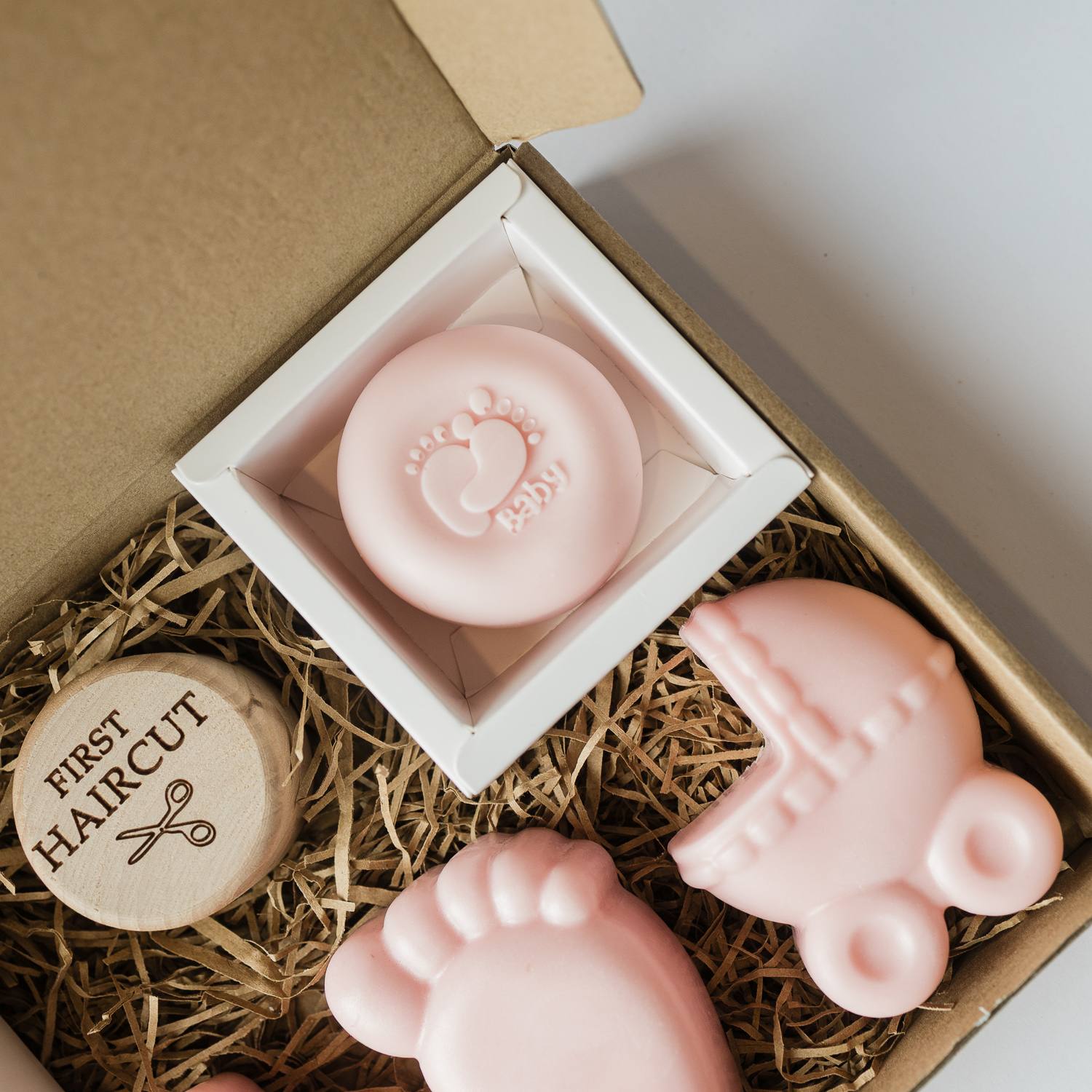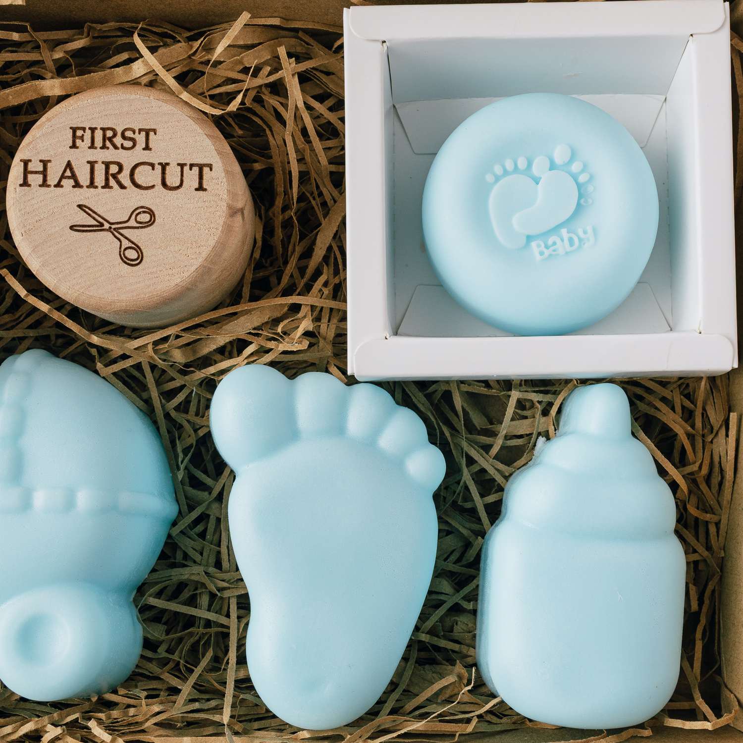 The ultimate baby-themed gift! This charming set includes six handmade soaps: a bottle, a foot, a teddy bear, a pram, two round soaps with tiny footprints and small wooden box for baby's first haircut. Soaps available in pink or blue and scented with comforting almond - perfect for baby showers, new arrivals or gender reveal gifts.