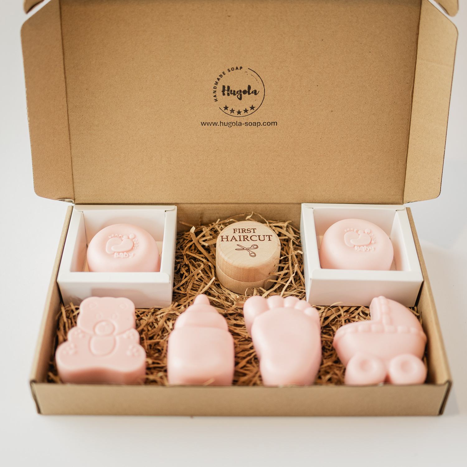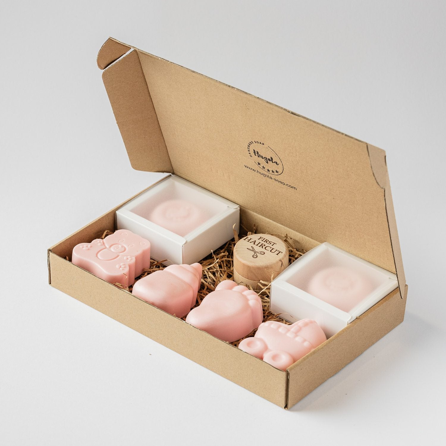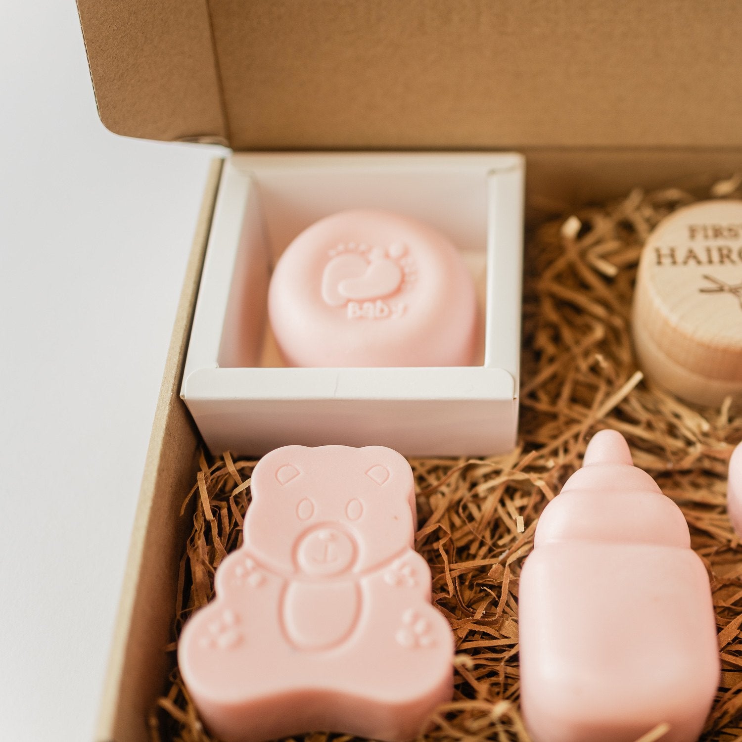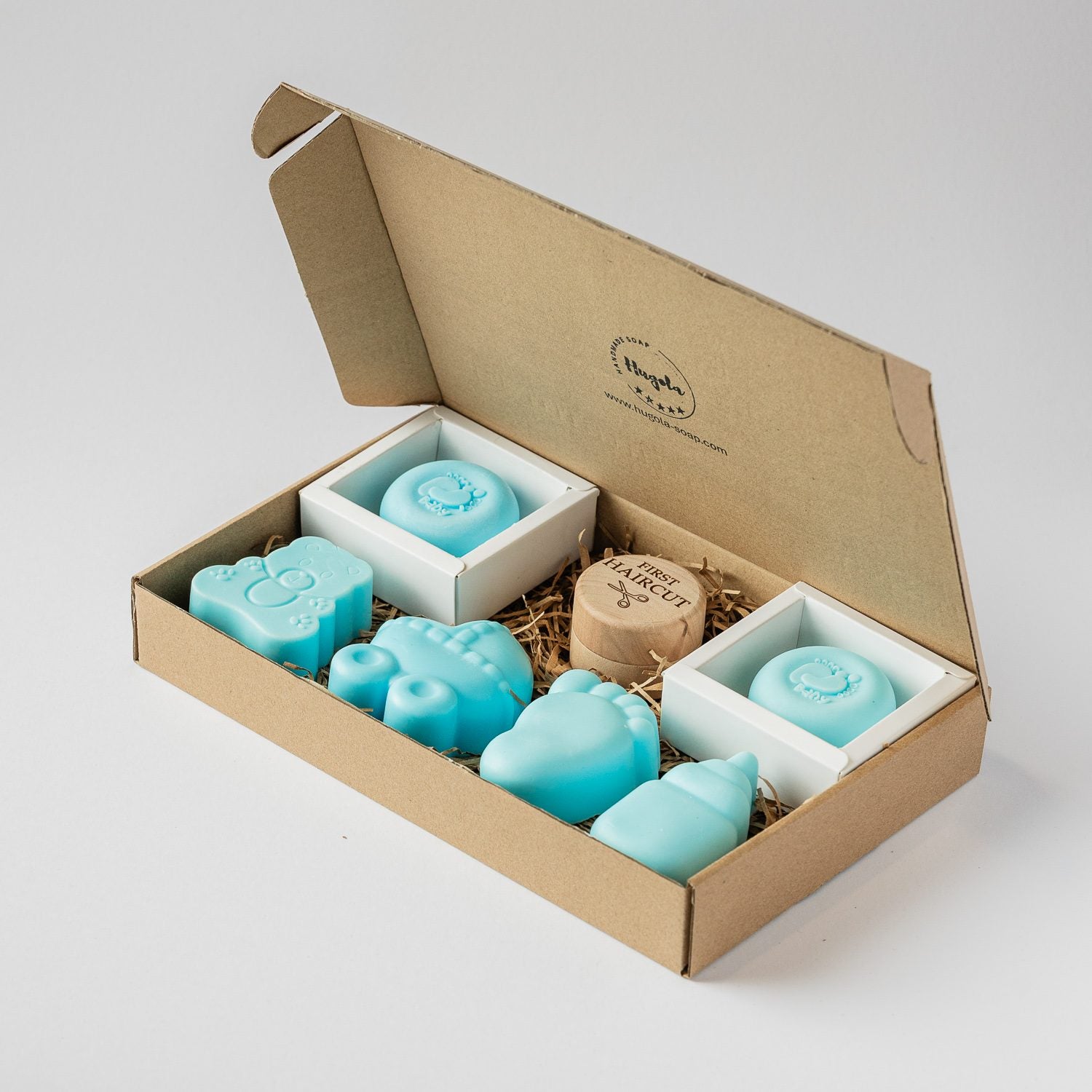 The ultimate baby-themed gift! This charming set includes six handmade soaps: a bottle, a foot, a teddy bear, a pram, two round soaps with tiny footprints and small wooden box for baby's first haircut. Soaps available in pink or blue and scented with comforting almond - perfect for baby showers, new arrivals or gender reveal gifts.