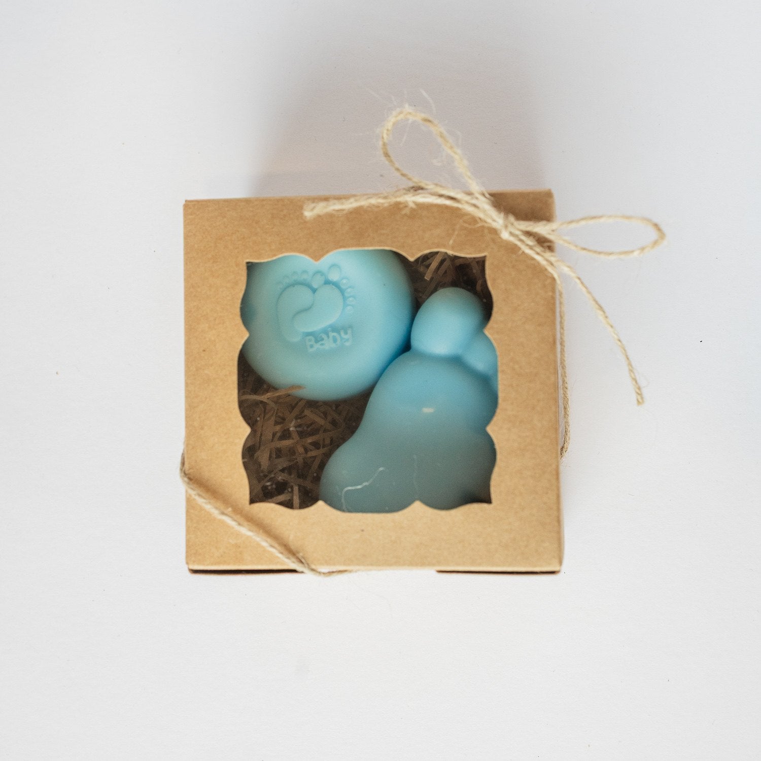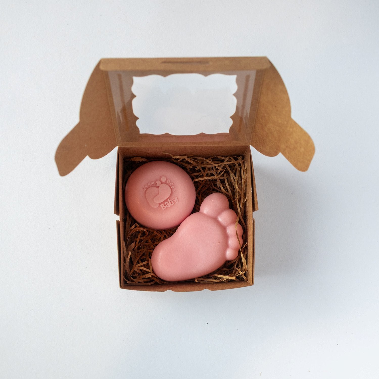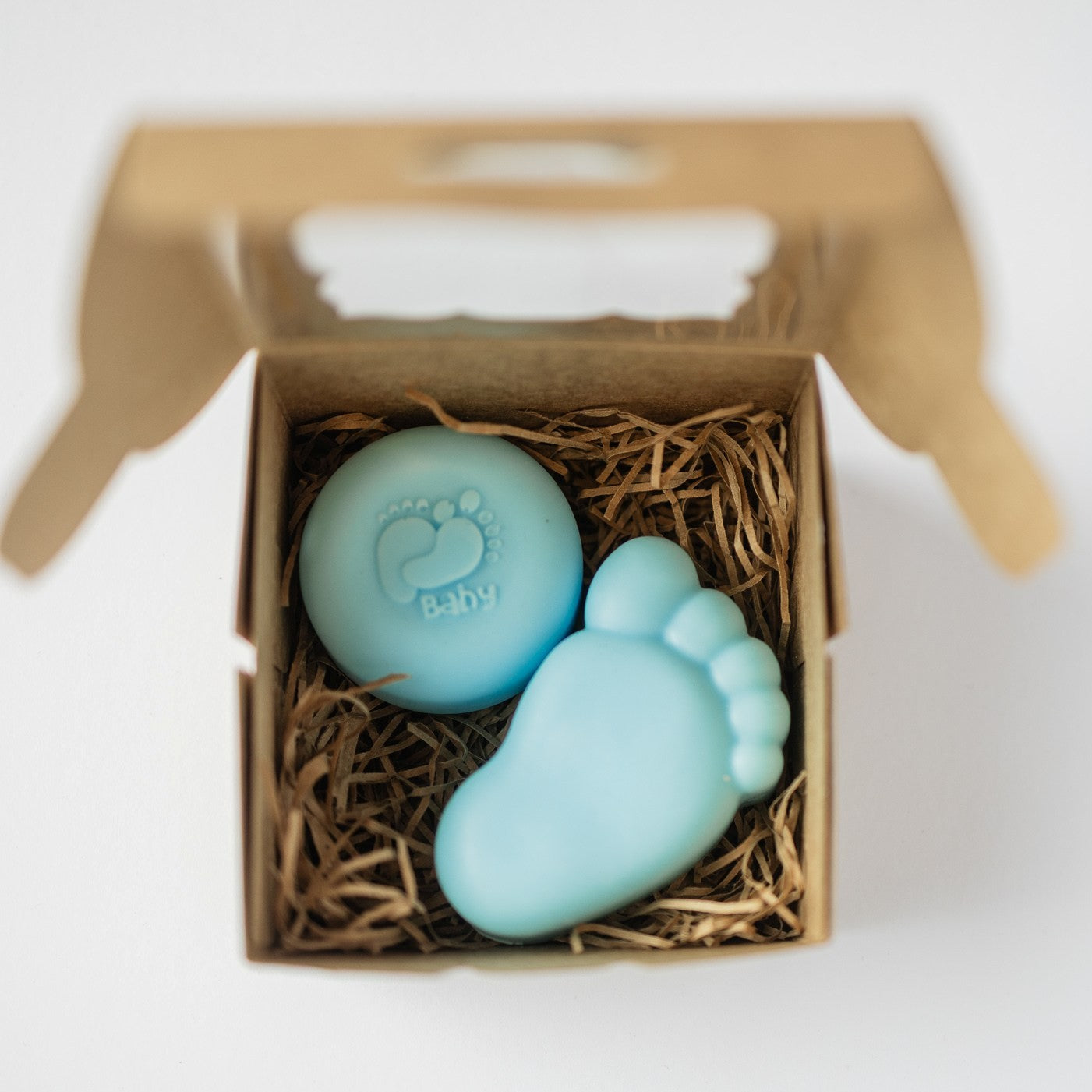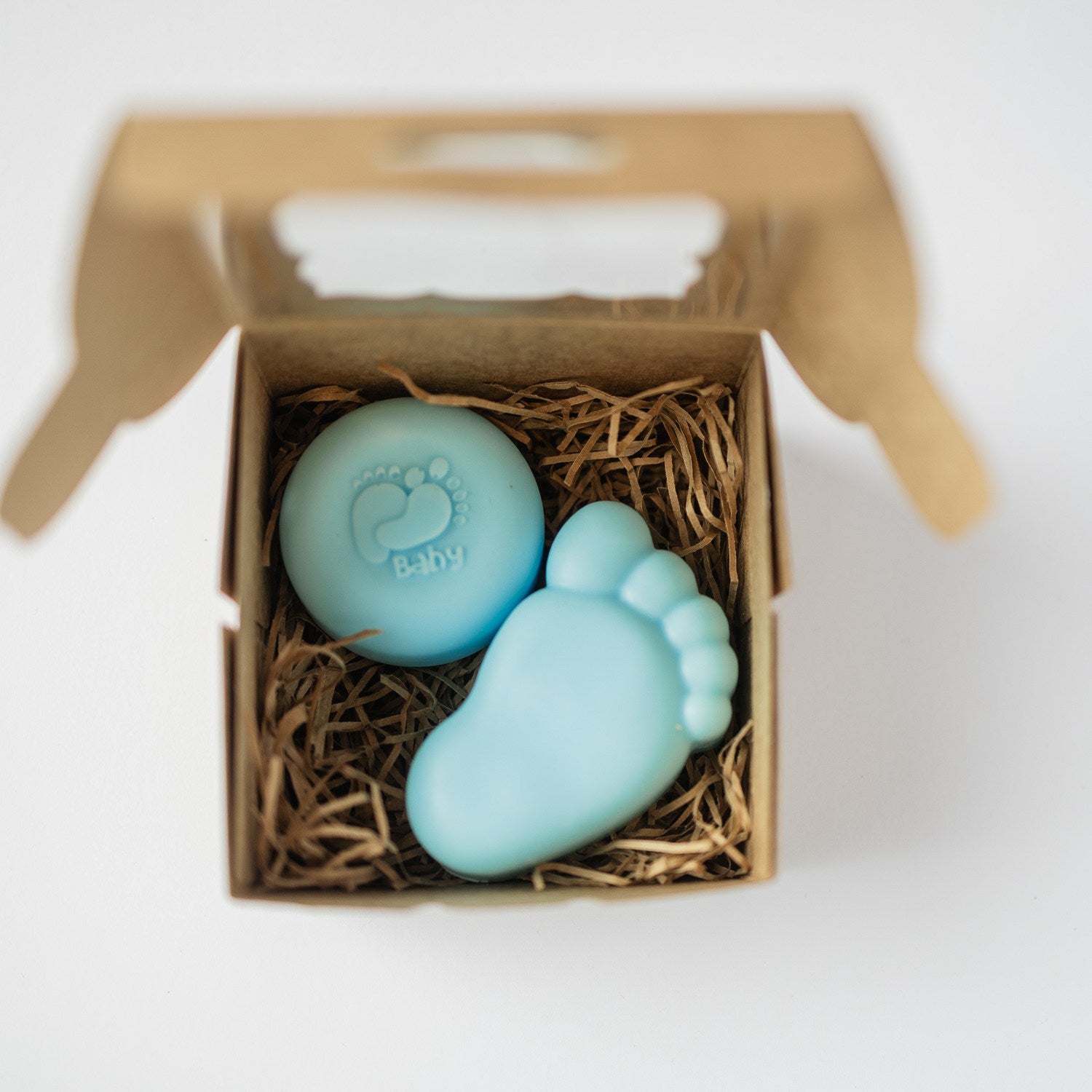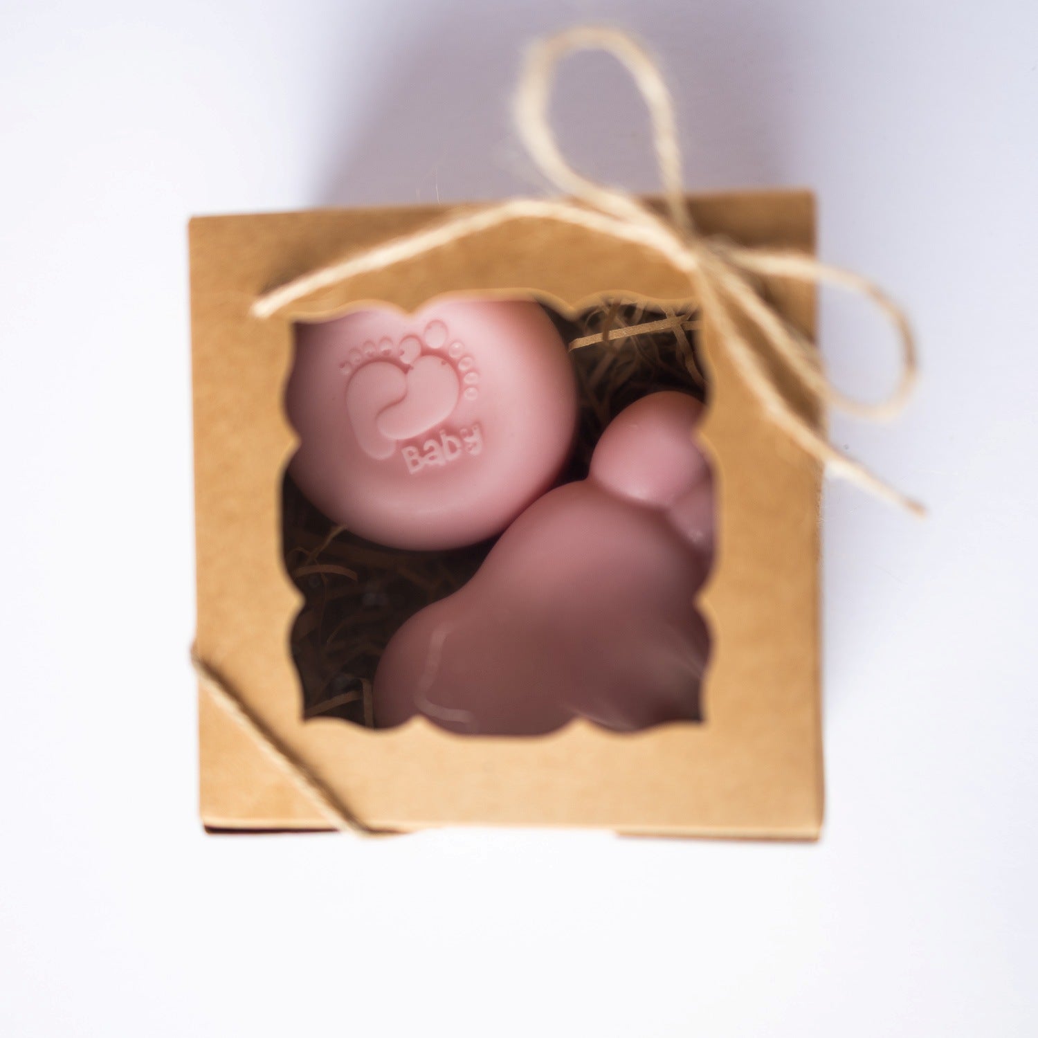 Celebrate new beginnings with this delightful baby soap duo - featuring a foot-shaped soap and a round soap with tiny footprints. Handmade and scented with soft almond, available in pink or blue - ideal for baby showers or welcome gifts for new parents.