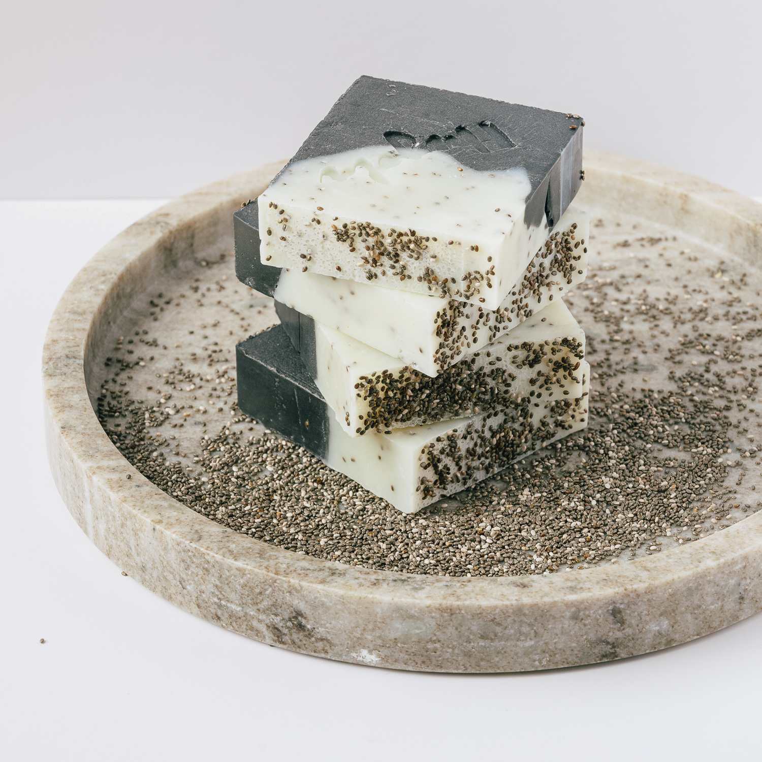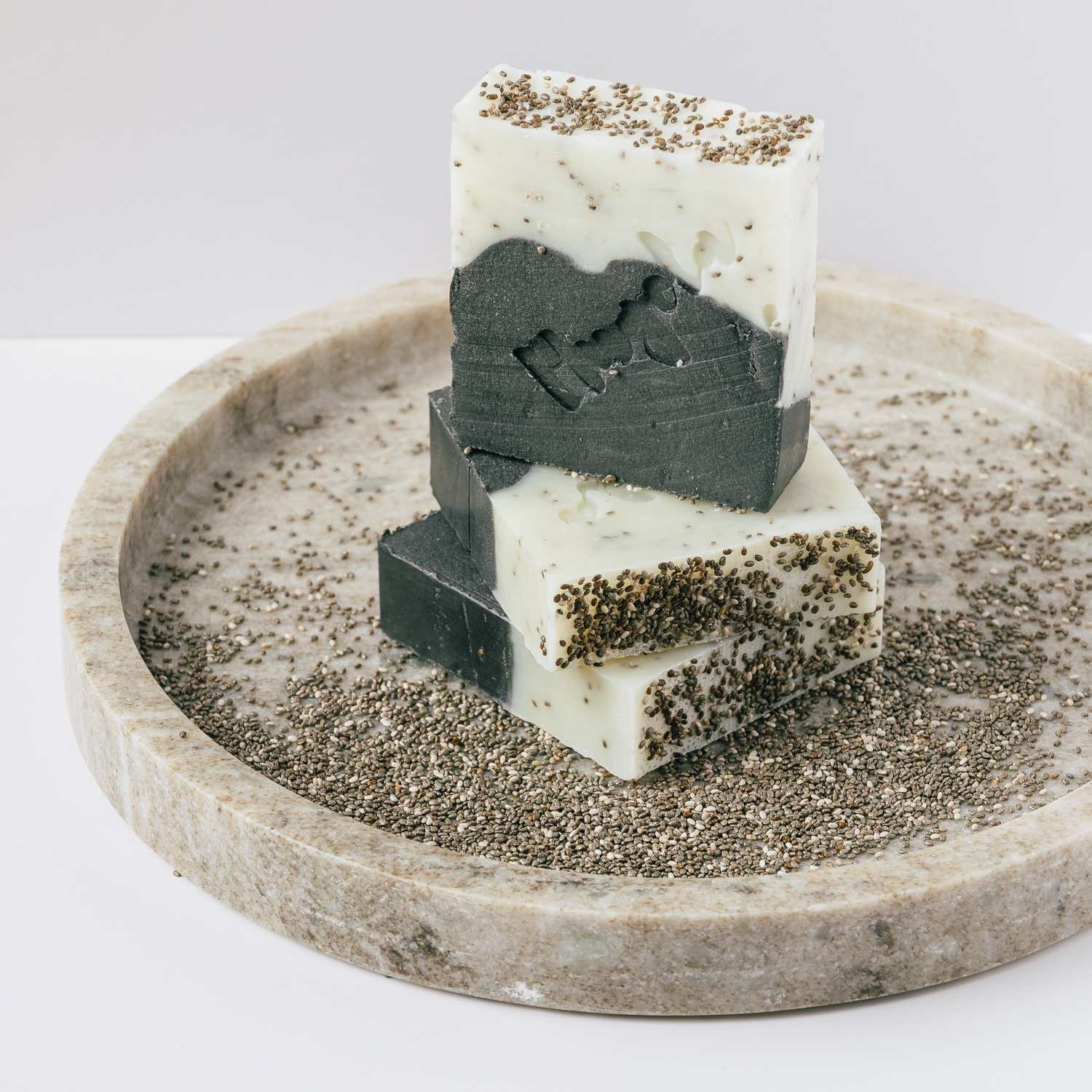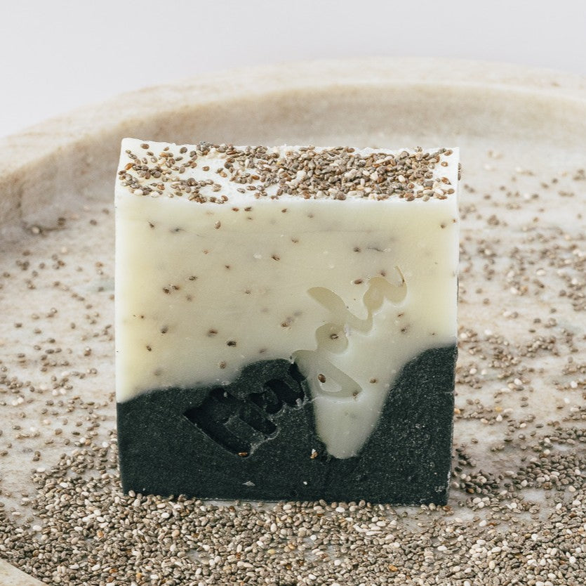 Striking, handmade bar crafted with a skin-nourishing blend of shea butter, olive oil, coconut oil, rice bran oil, and castor oil. Together, these ingredients deeply moisturise, restore balance, and support skin softness. Charcoal draws out impurities and excess oil, while finely textured chia seeds provide gentle exfoliation, helping to smooth the skin’s surface and promote a healthy-looking glow.