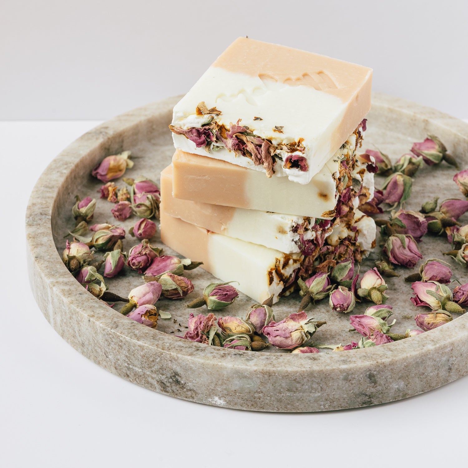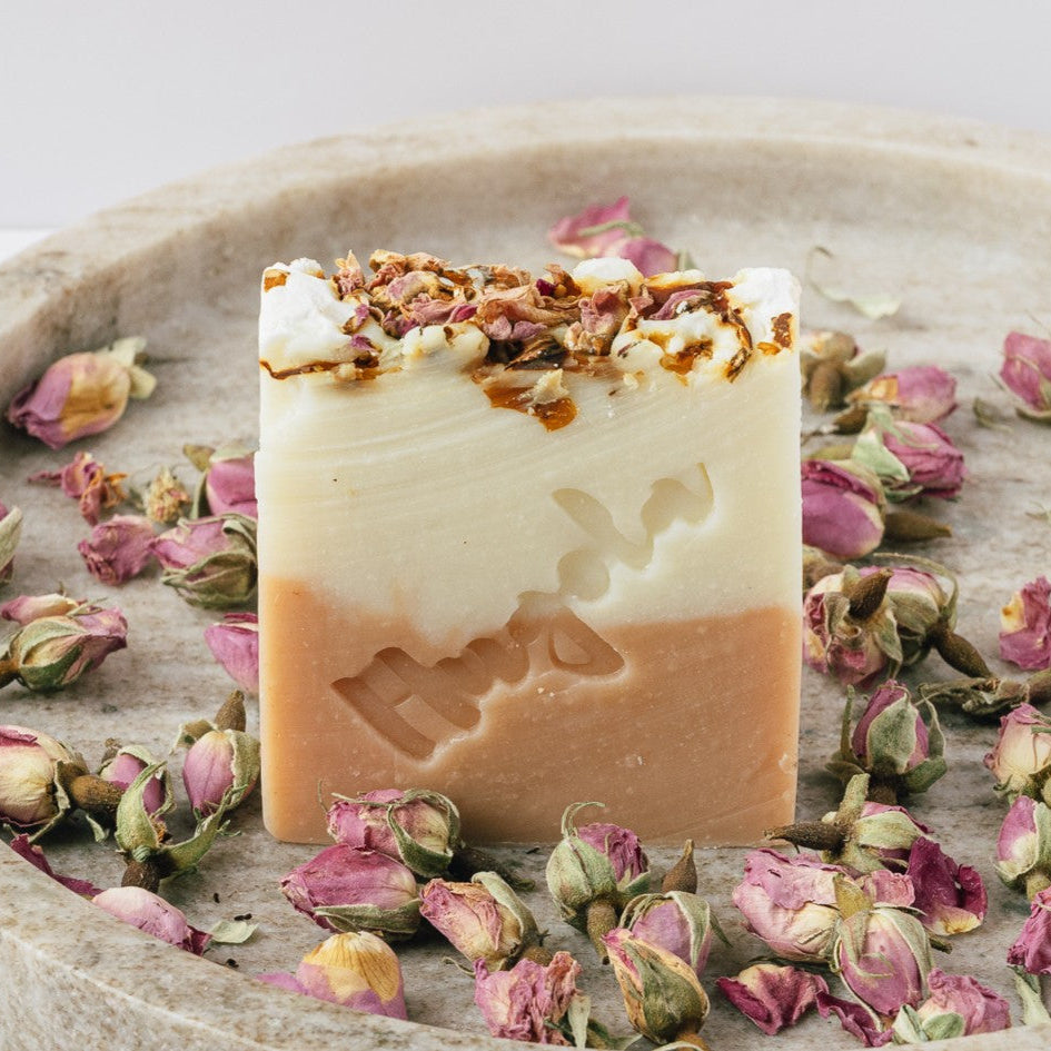 Rich in olive oil, shea butter, and sweet almond oil, this soap offers deep nourishment and gentle care for your skin. Coconut oil cleanses lightly, while cocoa butter and castor oil create a creamy, velvety lather. Mineral-rich pink clay help purify and soften, leaving skin feeling fresh and balanced. Delicately scented with a romantic rose fragrance and adorned with rose petals, this soap is ideal for mature and vascular skin — leaving it soft, smooth, and beautifully perfumed all day long.